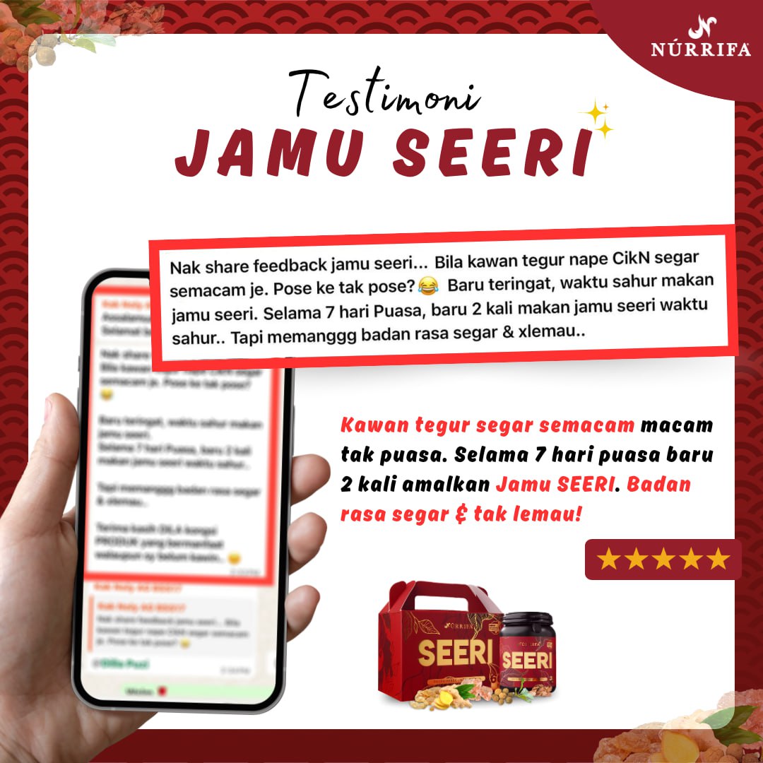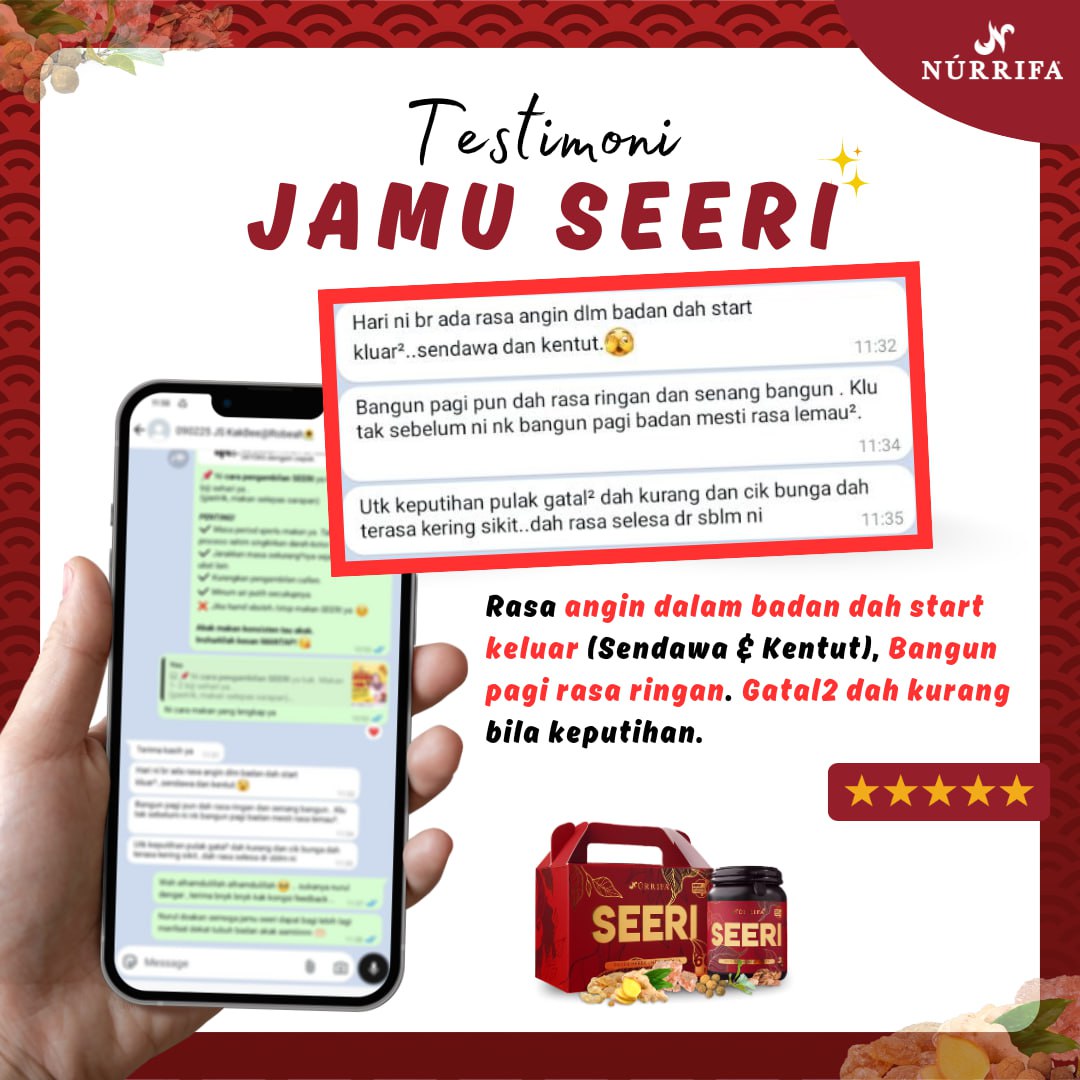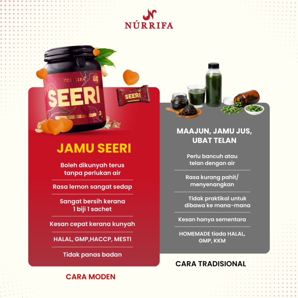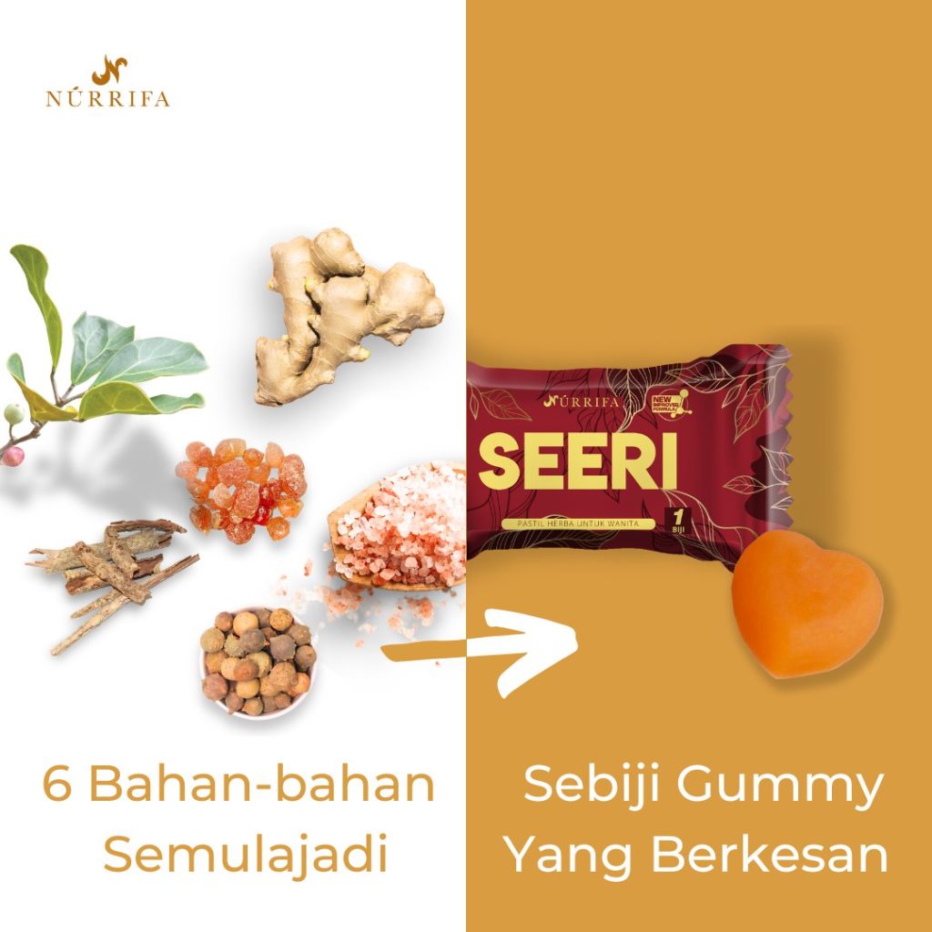 Extract Bahan Semula Jadi JAMU SEERI iaitu MAS COTEK, MANJAKANI, HALIA BENTONG & SERAPAT yang terbukti berkesan pulih keseimbangan Hormon, keselesaan Miss V & Tubuh lebih selesa.