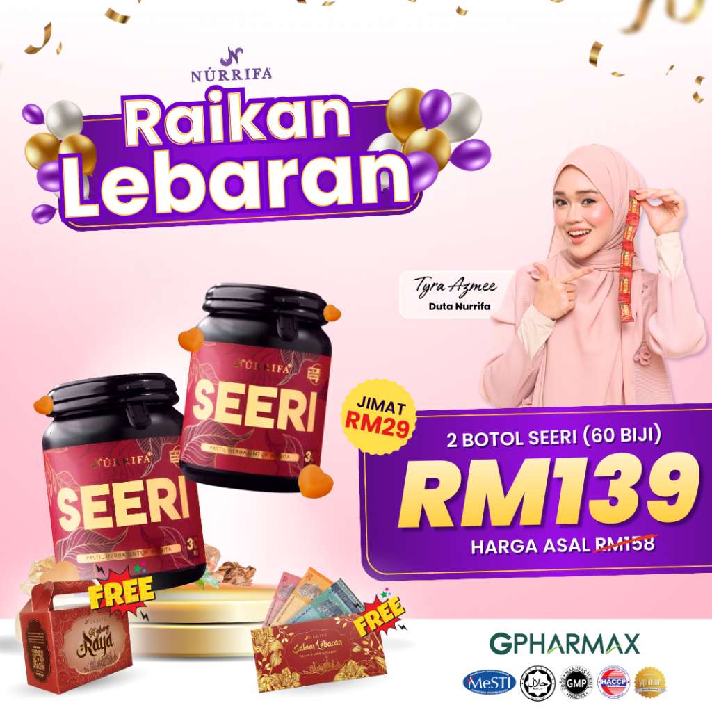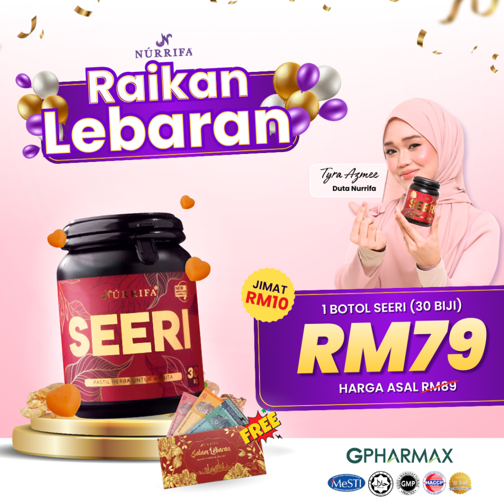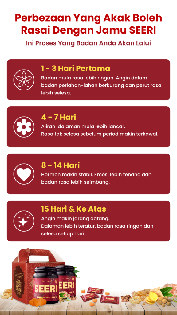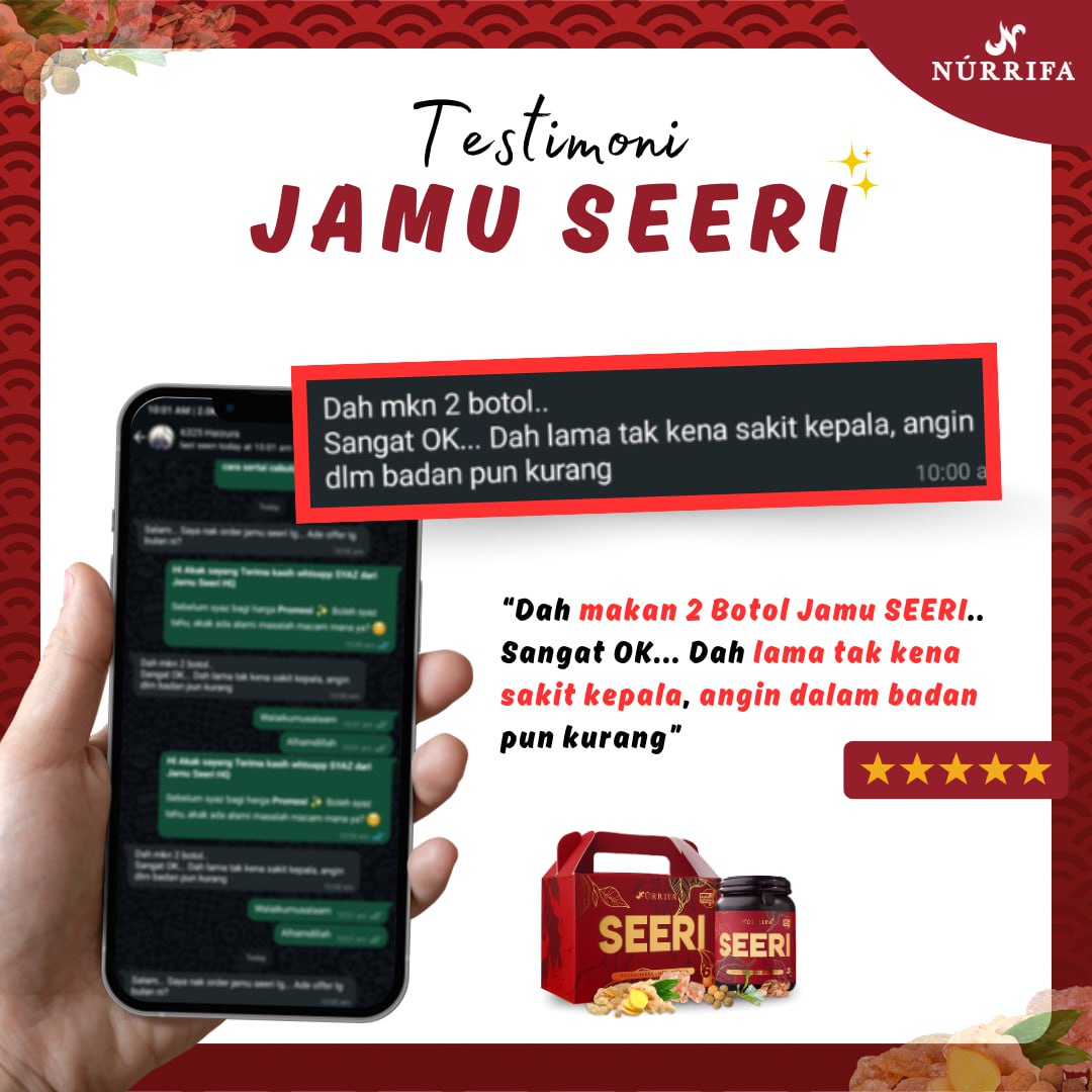 Extract Bahan Semula Jadi JAMU SEERI iaitu MAS COTEK, MANJAKANI, HALIA BENTONG & SERAPAT yang terbukti berkesan pulih keseimbangan Hormon, keselesaan Miss V & Tubuh lebih selesa.
